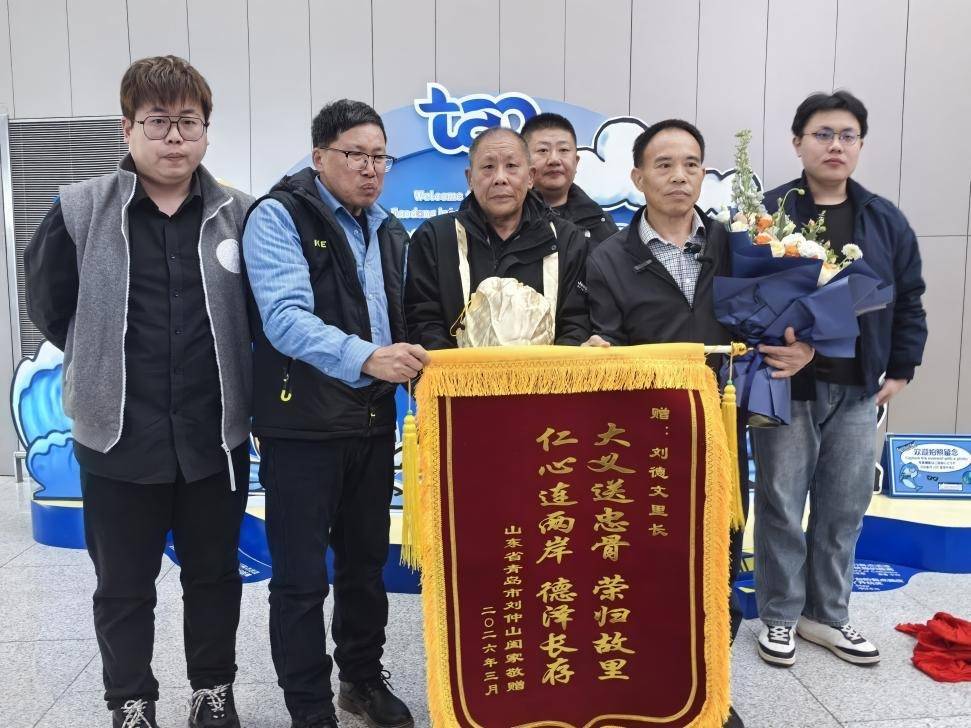 3月29日晚7时45分,刘德文抱着一个骨灰坛,缓缓走出青岛胶东国际机场到达出口。又一位去台老兵,在他的帮助下魂归故里。记者在现场看到,老兵的多位亲属早已等候多时。看到刘德文走出来,亲属们迎上前去,神情凝重,眼含热泪。简短的交接仪式后,骨灰被郑重转交到相关亲属手中。亲属们不停地向刘德文致谢,送上鲜花和锦旗。